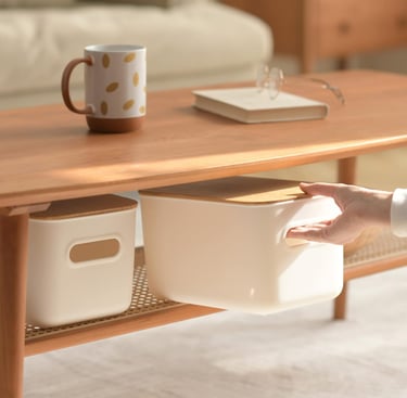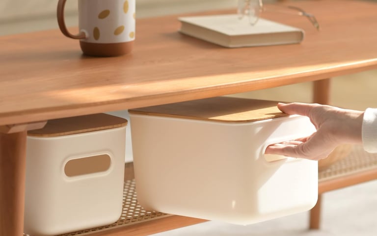 Stylish woven baskets or plastic storage boxes can add a chic, organized touch to your space. These storage bins not only help declutter but also complement any décor style with their sleek design.