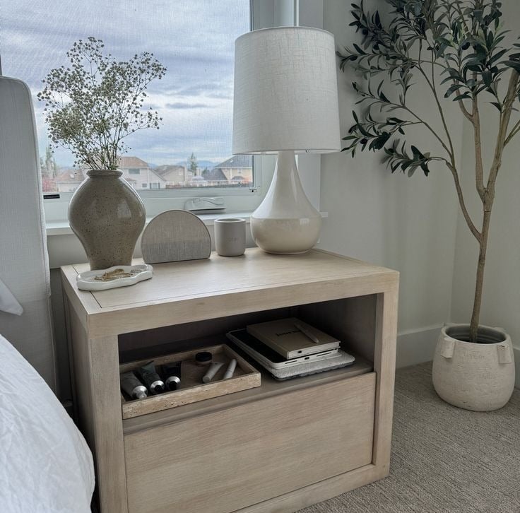 One of the easiest ways to make your space feel intentional is to style it. Keep your nightstand minimal but beautiful—think a stack of books, a candle, a ceramic tray, and maybe a little greenery.