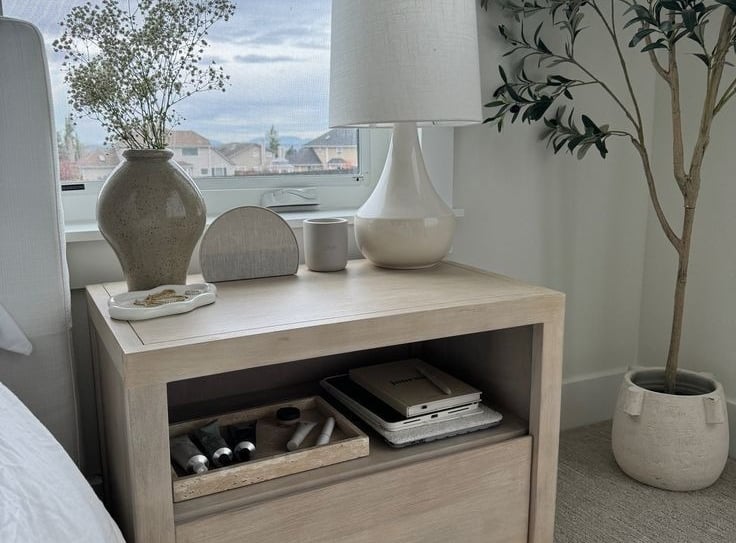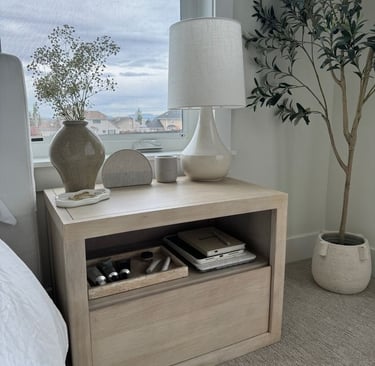 When styling surfaces like your bedside table, shelves, or dresser, keep it simple but thoughtful. Group items like candles, a few favorite books, decorative trays, and ceramics to create mini displays that feel curated.