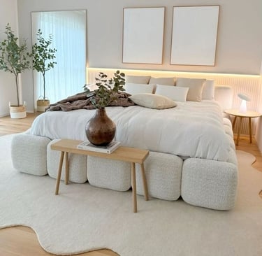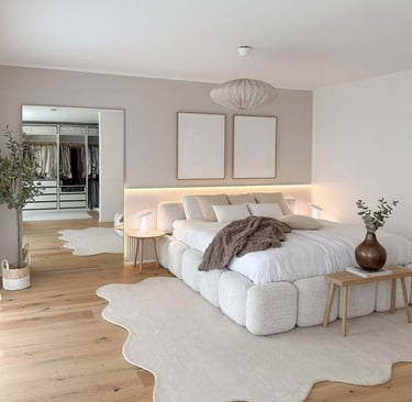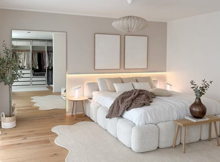 A rug adds instant warmth and texture, especially in a neutral room. It helps define the space and softens hard flooring, making your bedroom feel more inviting. Choose a rug that’s large enough to sit under the bed and extend beyond the sides—ideally in tones like beige, taupe, or cream to keep the look cohesive. Textured rugs like jute, wool, or low-pile options work beautifully to create that soft, layered feel without overpowering the room.