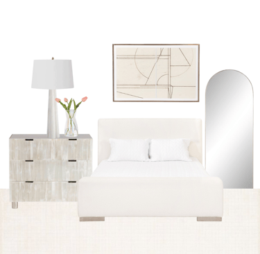 Shop: Bedframe | Rug | Side table | Table Lamp | Art work | Mirror | Vase