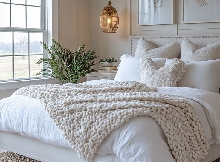 Layering is key — think throw blankets folded casually, and cushions in varying textures and sizes.