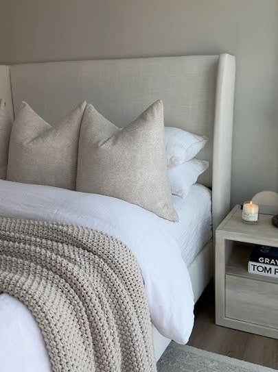 Lala’s tip: Follow the 60-30-10 color rule — 60% of your room should be your main neutral color, 30% an accent neutral or soft shade, and 10% a bold accent color. This helps create visual balance and harmony. Balance is important in a bedroom