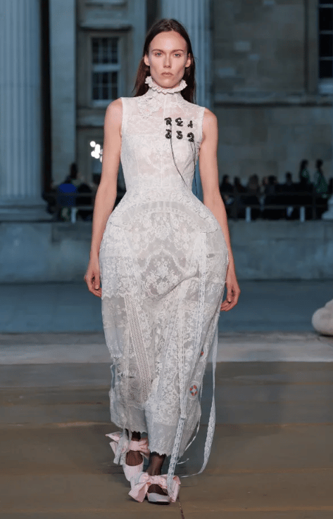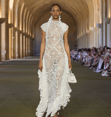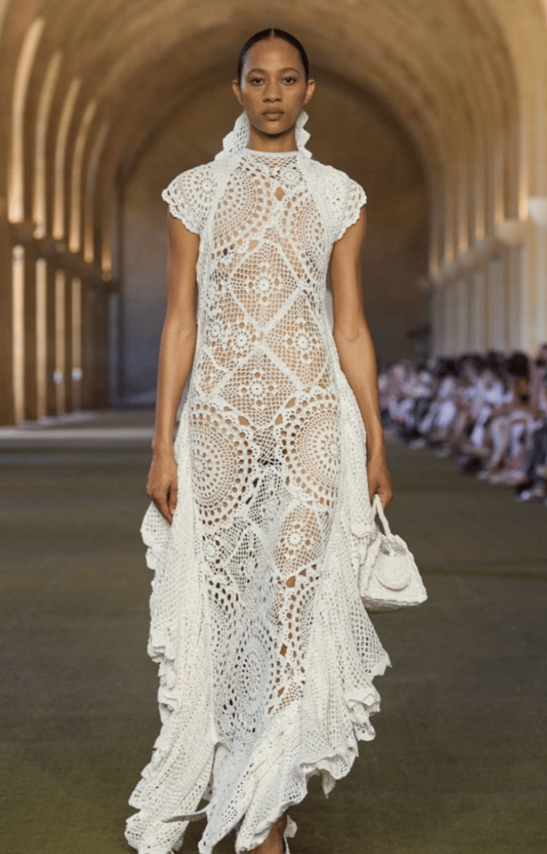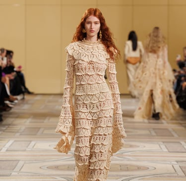 For Spring 2026, Erdem revisits these early lace traditions through a contemporary lens. Centred on an exaggerated hourglass silhouette and inspired by the late nineteenth-century Swiss medium Hélène Smith, the collection moves fluidly across centuries, as highlighted by Daisy Maldonado from InStyle. Intricate lacework appears alongside sculpted hips, vibrant brocades, and romantic detailing. While the silhouettes feel bold and modern, the lace itself subtly references its sixteenth-century origins, transforming early decorative techniques into something expressive, dramatic, and unmistakably current.